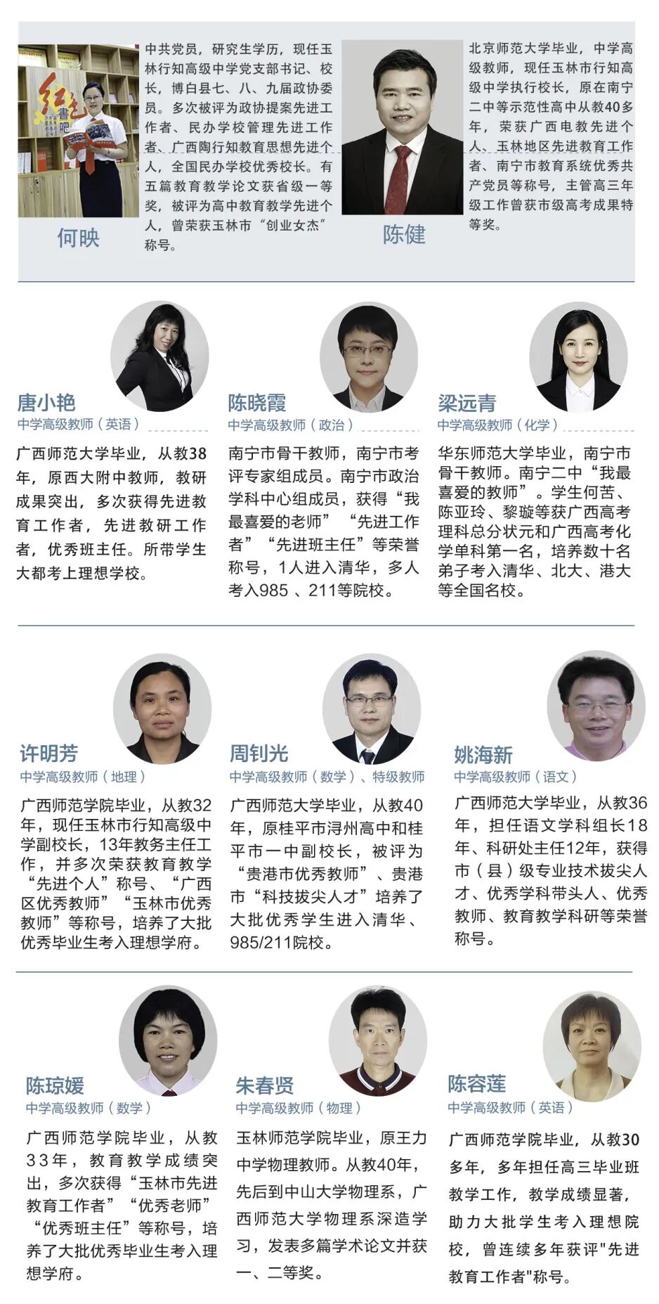 行知高中师资力量雄厚,特聘一批南宁市、玉林市名师加盟;学校有高级教师 16人,一级教师 19人,另有一大批年富力强优秀青年教师。教师们具有先进的教育理念和丰富的教学经验,努力为学生提供高质量的教育教学服务。